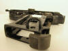Mauser byf44 with slide made by FN. Blued finish on the frame and some small parts. Various shades of phosphate finish on the remainder of the pistol - darker on the slide and some small parts such as the slide stop, magazine catch, and magazine. Very thin to no finish on the barrel and trigger. Mauser plastic grips.