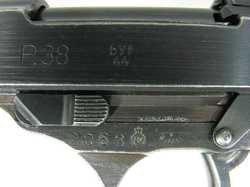 Mauser produced approximately 3,800 byf44 coded P.38s for police use. Pistol number 2063 below is one of these. At some point it fell into the hands of the British, who applied their own set of markings to the barrel, frame, and slide.